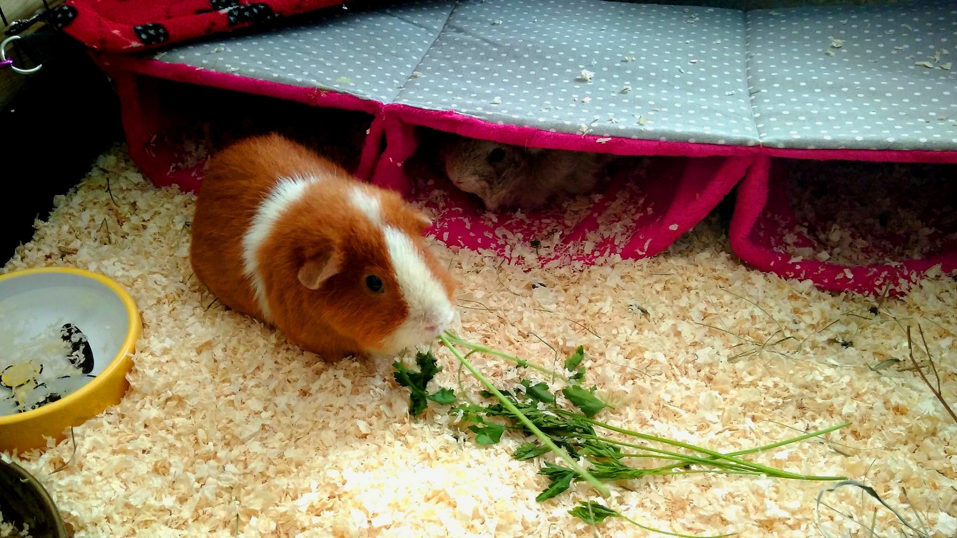 Bardzo dziękuję za ciepłe słowa, Zuzia była niepowtarzalną świnką, drugiej takiej nie ma. Tosia przeżyła mocno jej zniknięcie, stała się cicha i wycofana. Z sekcji wiemy, że Zuzia odeszła z powodu niewydolności krążeniowo-oddechowej, w jej organizmie była też niejedna zmiana nowotworowa, na dokładny opis sekcji jeszcze czekamy, ale wiemy, że nie była to choroba zakaźna, która mogłaby zagrażać Tosi. Tego samego dnia Tosia również była na wizycie lekarskiej i fizycznie wszystko jest w porządku. Widząc zmianę w zachowaniu Tosi następnego dnia przyjęliśmy na DT 3-letnią samiczkę - Shadow. Shadow odbyła swoją pierwszą wizytę lekarską, jak na swój wiek jest bardzo malutka - waży zaledwie 512g. Ma grzybicę i zapalenie górnych dróg oddechowych. Mieszkała jednak większość życia w dużym stadzie z innymi świnkami i będąc u nas sama była ogromnie zestresowana. Tak ogromny stres nie pomaga w leczeniu a Tosia była coraz bardziej osowiała po stracie Zuzi. Zdecydowaliśmy się więc w porozumieniu z lekarzem łączyć Tosię z Shadow bez kwarantanny i pomimo choroby Shadow. Łączenie było spokojne i przyniosło ogromne zmiany - Tosia na powrót zrobiła się głośna i aktywna. Mimo podjętego ryzyka nie widzę lepszego rozwiązania. Dziewczyny są razem od piątku, dogadują się bardzo dobrze. Shadow ucieka histerycznie przed dotykiem ludzkim, ale nie reaguje już paniką na samą naszą obecność i poruszanie się w pobliżu klatki.